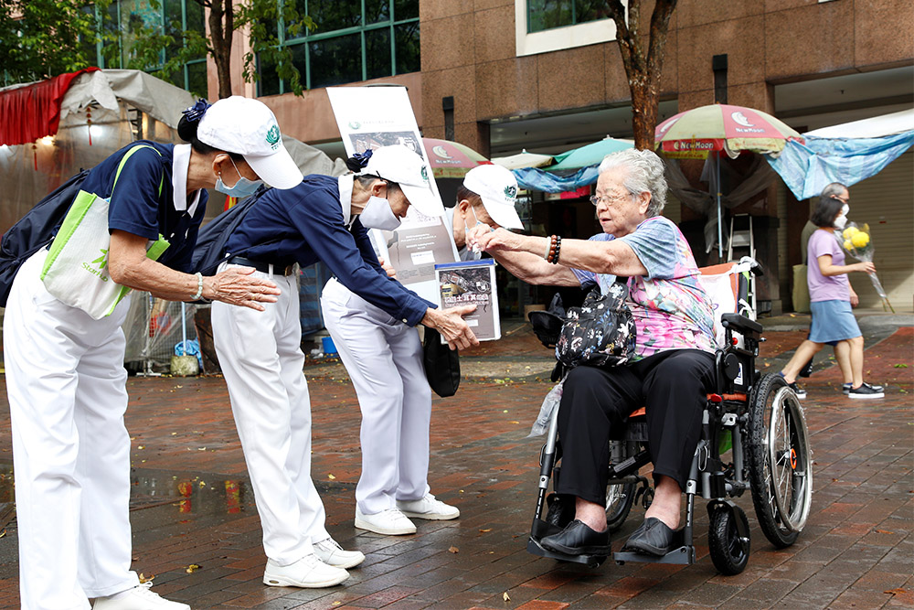 "With an understanding heart for the sake of the victims, I can pull through even if my feet ache," Hoo Soo Moi said. Passers-by were moved by the enthusiasm of the elderly volunteers and generously gave, prompting Hoo Soo Moi to exclaim, "Singaporeans are very caring!"