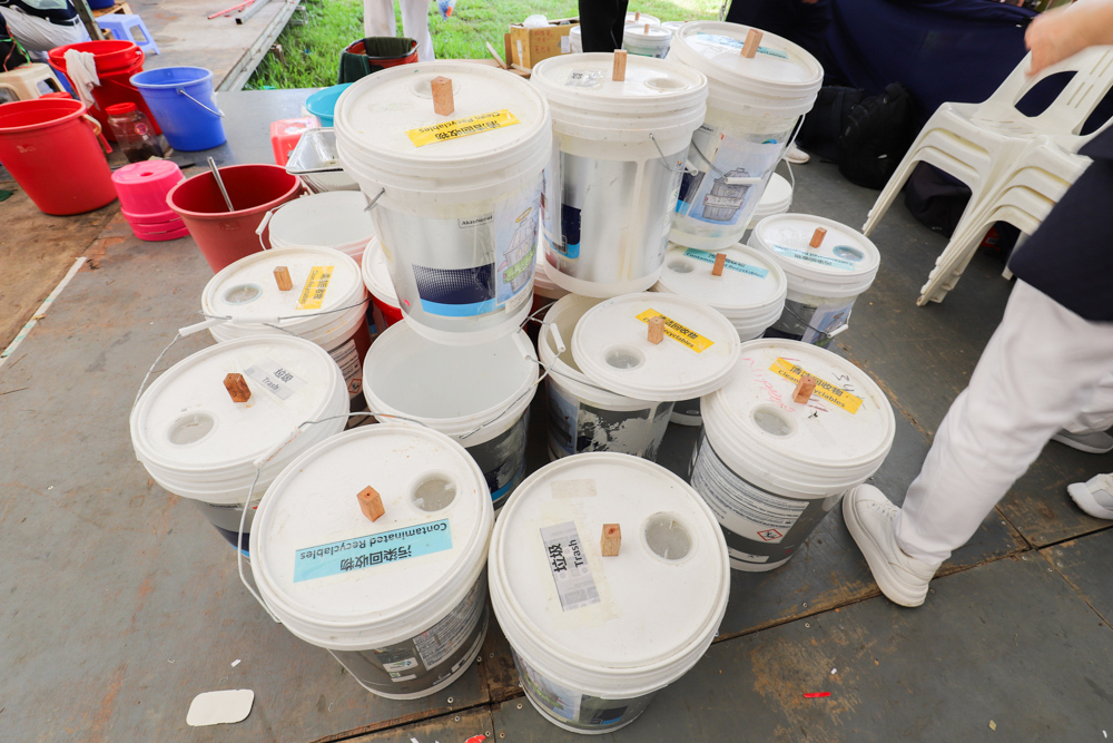 Drawing on past years’ experience, the environmental protection team made a change this year – instead of providing the vegetarian food stalls with three large plastic bags for general waste, recyclables and washed recyclables, the team replaced plastic bags with three large barrels with lids to reduce the use of plastic bags.