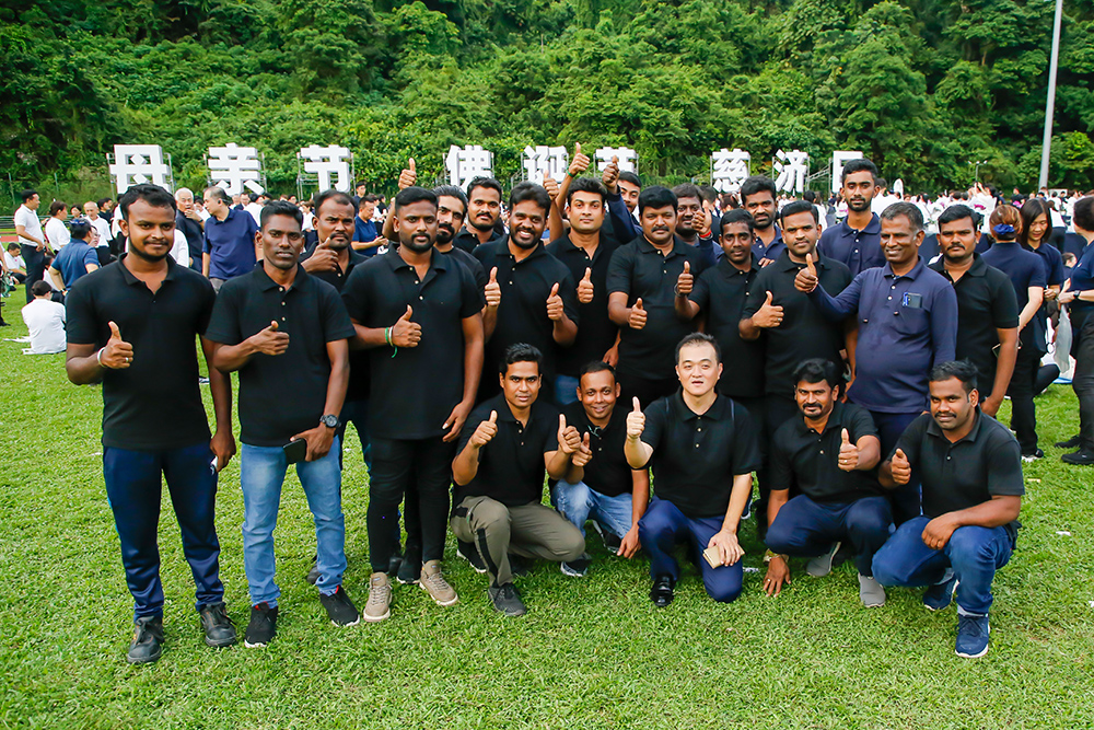 "Boss, come over here and join us," said Sarkar Suman, a Bangladeshi migrant worker, happily inviting his boss Gan Ah Huat in Mandarin to take a group photo together. Together with fifteen other foreign workers who lived together, it was already the fourth time Sarkar had served as a group formation volunteer with Tzu Chi, and he seemed very familiar with the process.