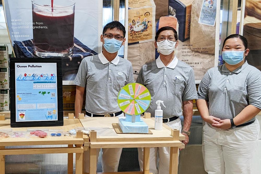 赖晓梅(右)和队友颜明德(左)与王仁寿(中)在这次的“海洋污染”环保教育摊位中合作愉快。(摄/ 余慧慧)