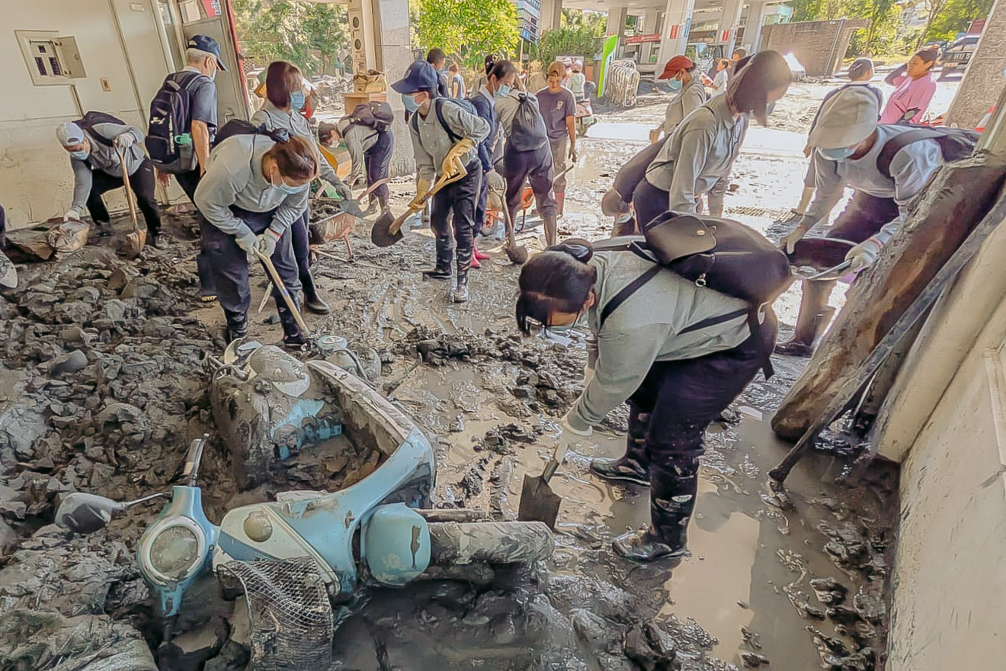 服装店老板娘也在现场一起清理。小休时我们与她家交谈,她在说起此次灾情严重,在提及台湾民众为乡民们付出时,还流下了感动的落泪,口中不停道谢。一旁的师父和师兄姊们,也不停地给予她鼓励,画面令人感动。