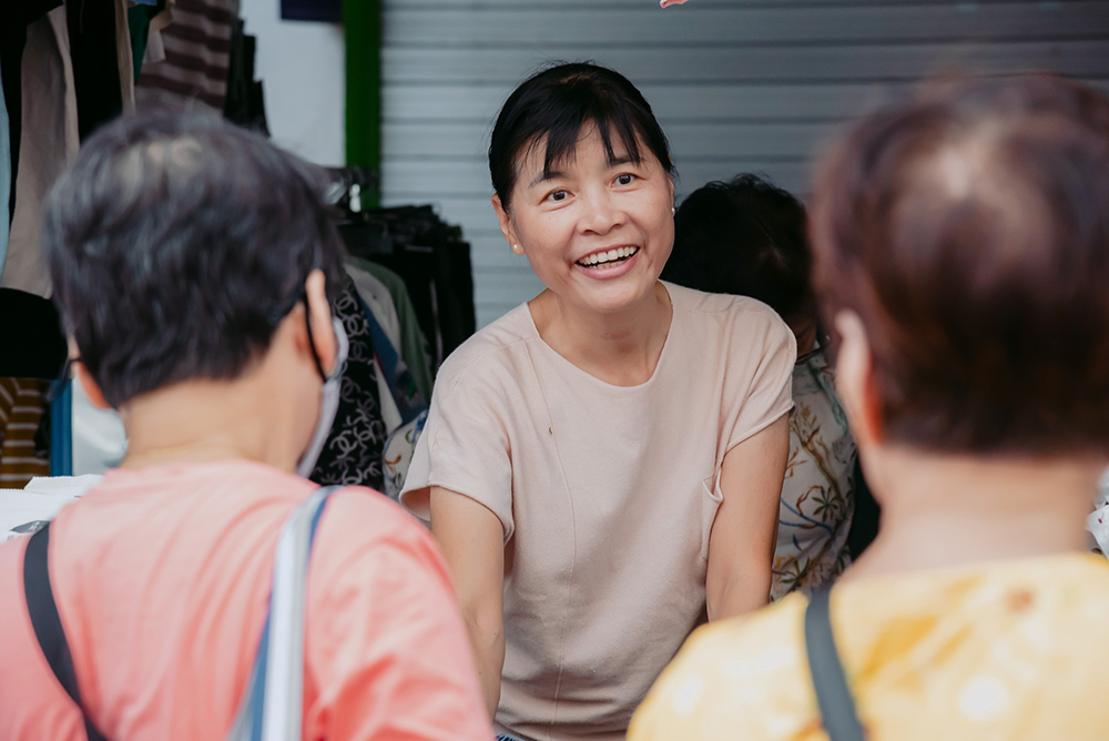 51岁的林淑菓另一个身份是慈济志工,在这个小小女装摊位,她前前后后接引了三百多人加入慈济会员,邻近的婆婆妈妈定期来报到,交善款的,交竹筒扑满的,还有人在她的邀请下,渐渐投入志工服务。